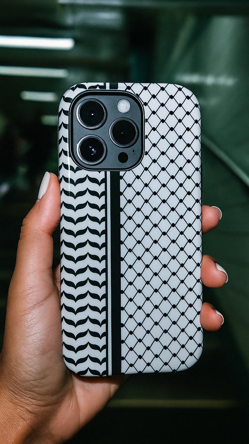 Bold, patterned, and unapologetically iconic. The Kuffiya Pattern iPhone Case draws inspiration from timeless textile motifs, reimagined with a modern edge. Whether you choose the minimal version or the one accented with subtle text in bold colors, this case brings cultural texture and strong identity straight to your pocket.
